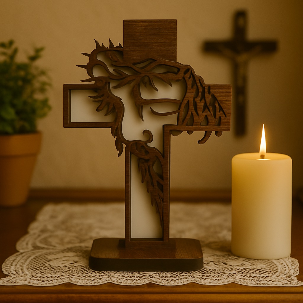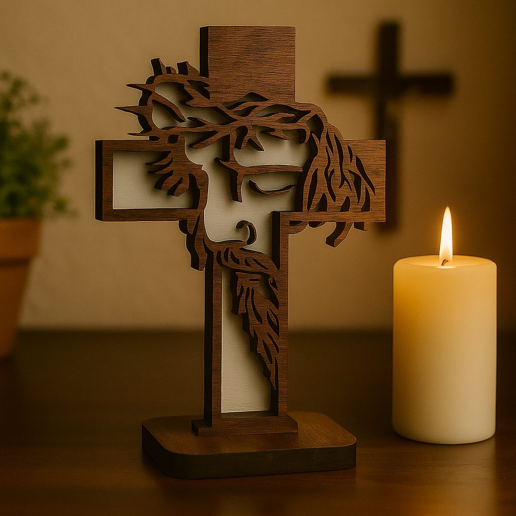 Uma peça que transmite silêncio. reverência e fé profunda: esta cruz artesanal em madeira traz o rosto de Cristo coroado de espinhos. delicadamente recortado com design minimalista e marcante.