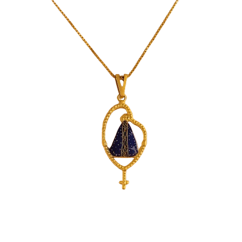 Elegante colar com a imagem de Nossa Senhora Aparecida em moldura. banhada a ouro. simbolizando fé. proteção e devoção. Com acabamento delicado e refinado. esta peça é perfeita para quem deseja carregar a presença da Padroeira do Brasil consigo. trazendo bênçãos e espiritualidade ao dia a dia.