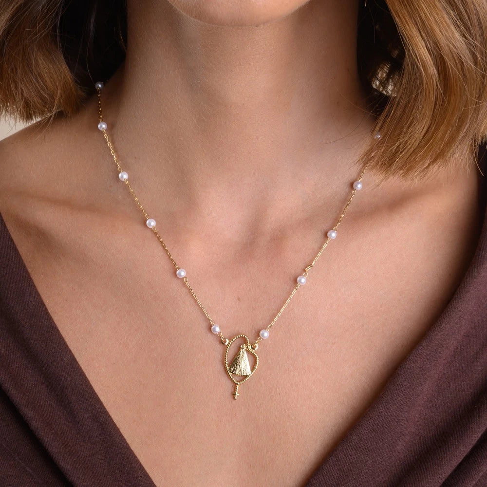 Elegante colar com a imagem de Nossa Senhora. adornado com pérolas e moldura folheada a ouro. simbolizando fé. proteção e delicadeza. Com acabamento refinado. esta peça é perfeita para quem deseja carregar consigo a presença divina. trazendo bênçãos. elegância e espiritualidade ao dia a dia.