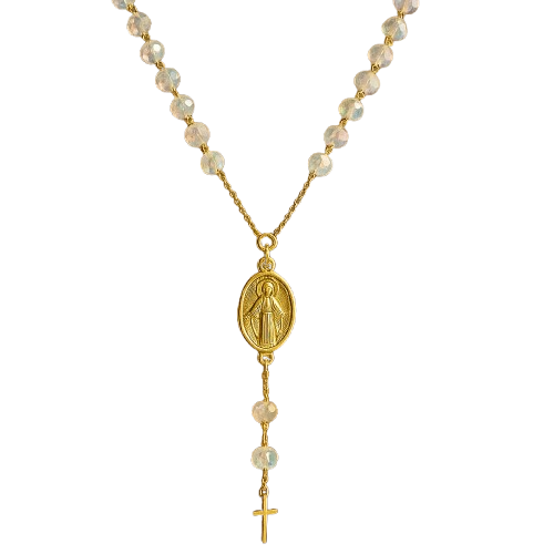 Elegante colar terço de cristal com a imagem de Nossa Senhora Aparecida. folheado a ouro. simbolizando fé. proteção e devoção. Com contas delicadas e acabamento refinado. esta peça é perfeita para quem deseja carregar a presença da Padroeira do Brasil. trazendo bênçãos e espiritualidade ao dia a dia.