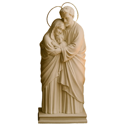 Imponente escultura da Sagrada Família. representando Jesus. Maria e José em atitude de união e amor. simbolizando proteção. harmonia e fé no lar. Com acabamento refinado em mármore e detalhes dourados nas coroas folheadas à ouro. esta imagem transmite paz. inspiração e a presença divina em seu dia a dia.