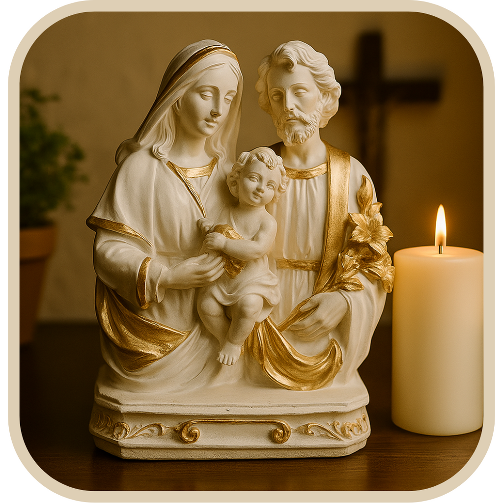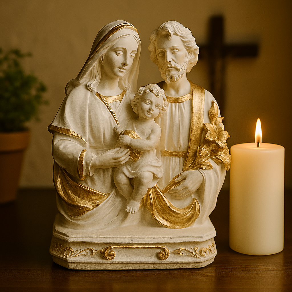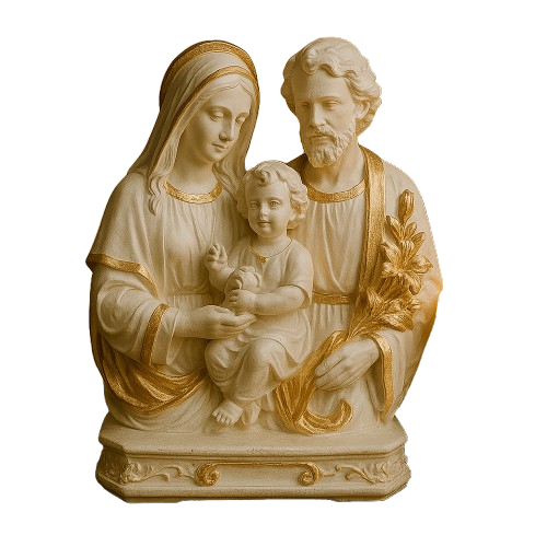 Imagem reverente da Sagrada Família. com Maria. José e o Menino Jesus. representada com expressão serena e detalhes dourados que realçam a beleza e espiritualidade da peça. Ideal para lares devotos. essa imagem simboliza a união. o amor e a proteção da família cristã.