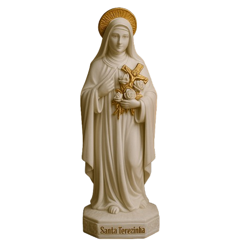 Uma imagem simples. mas cheia de profundidade espiritual. Santa Teresinha é representada com um acabamento em branco fosco e detalhes em dourado que destacam sua doçura e entrega. Ideal para quem busca viver a fé com simplicidade e confiança no amor de Deus.