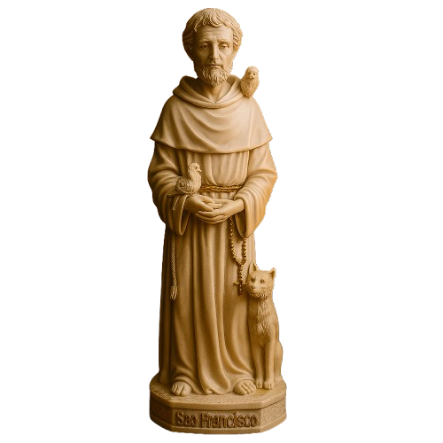 Esta imagem representa São Francisco de Assis. símbolo de paz. humildade e amor pelos animais e pela natureza. Com acabamento branco perolado e detalhes dourados. transmite serenidade e devoção. sendo perfeita para momentos de oração e decoração devocional.