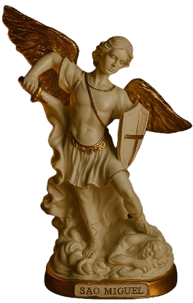 Imagem de São Miguel com 20cm de altura. da linha Decoração com Fé®. Representada com detalhes que expressam força e proteção espiritual. esta peça é ideal para oratórios. altares e ambientes devocionais.