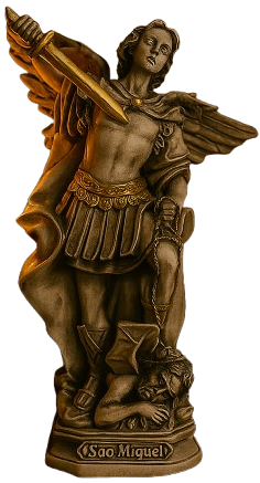 Imagem de São Miguel com acabamento marmorizado. com 30cm de altura. da linha Decoração com Fé®. Com traços imponentes e riqueza de detalhes. esta peça simboliza proteção. força e a vitória do bem sobre o mal. sendo ideal para ambientes de fé e oração.
