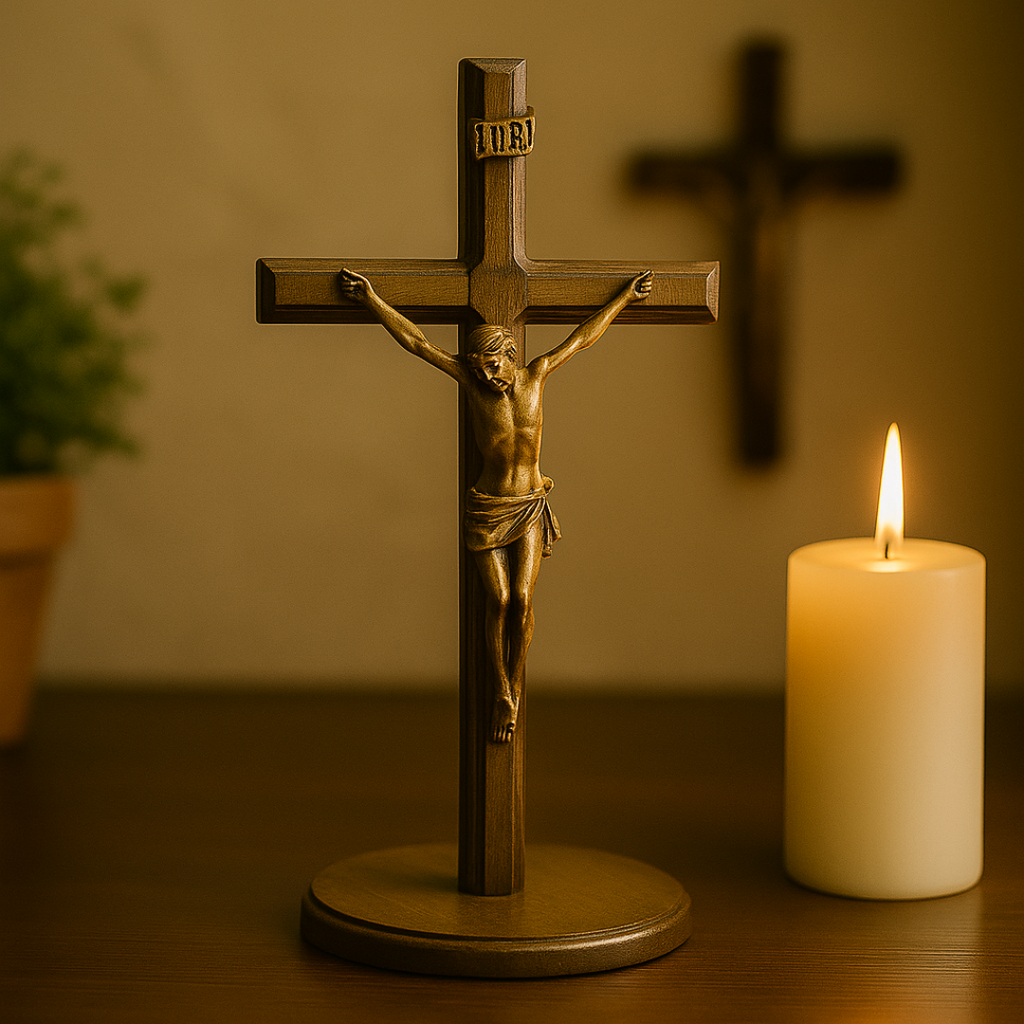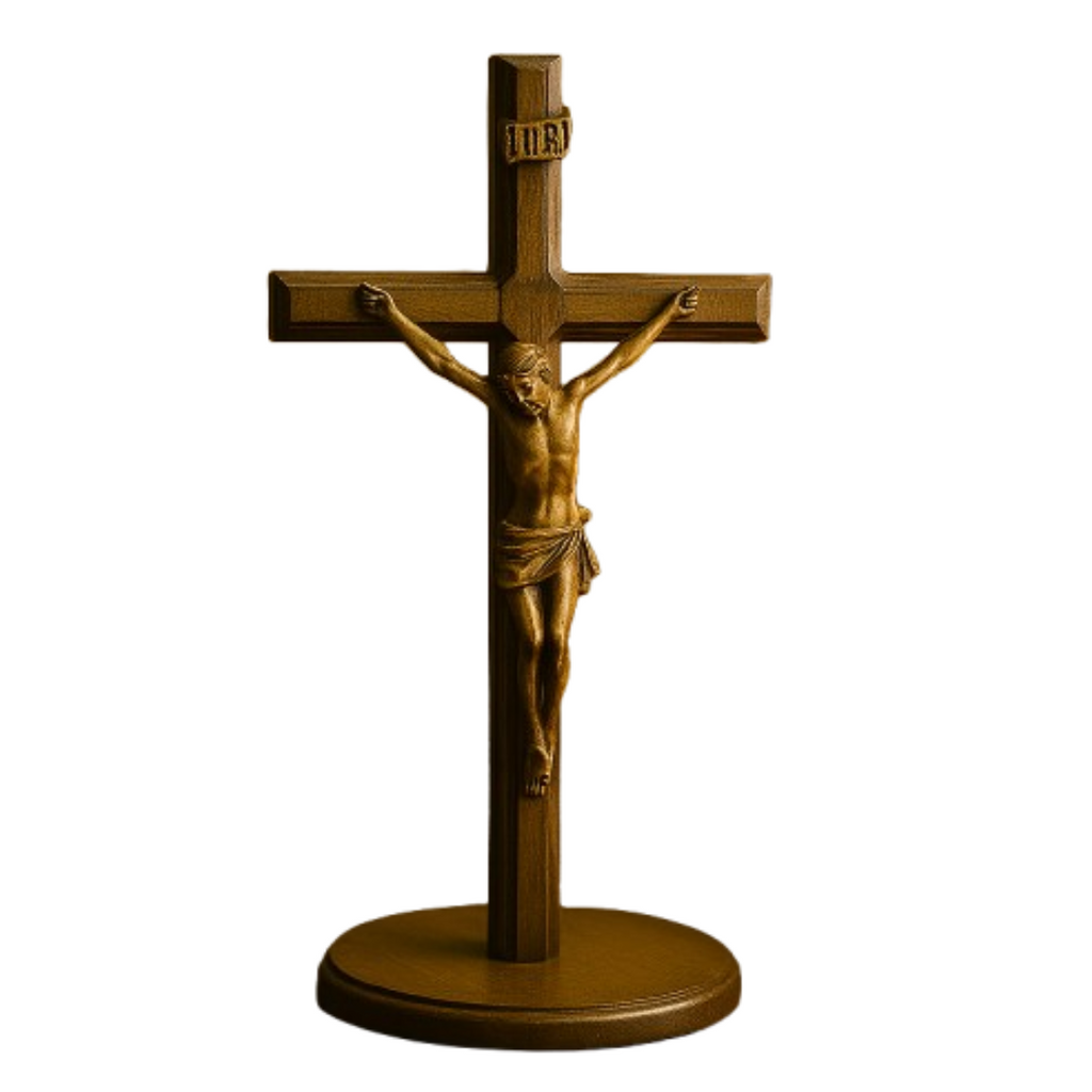 • ✝️ Crucifixo Clássico de Mesa 20cm – Símbolo da vitória de Cristo sobre o pecado e a morte.
