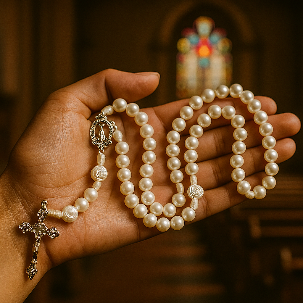 Este belíssimo terço confeccionado com contas em formato de pérola é ideal para momentos de oração e devoção. A medalha central apresenta a imagem de Nossa Senhora. enquanto o crucifixo delicadamente trabalhado adiciona um toque de reverência e sofisticação.