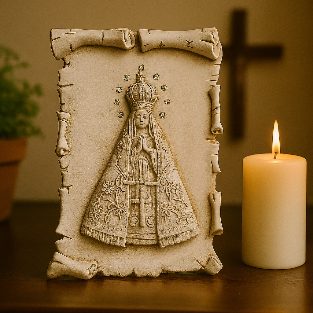 Este adorno de mesa é uma expressão de fé moldada com delicadeza e profundidade. A imagem de Nossa Senhora Aparecida aparece esculpida em relevo sobre uma peça que imita um pergaminho antigo. com detalhes florais. coroa e manto ricamente trabalhados. Pequenos pontos brilhantes ao redor da imagem destacam sua presença com luz e reverência.