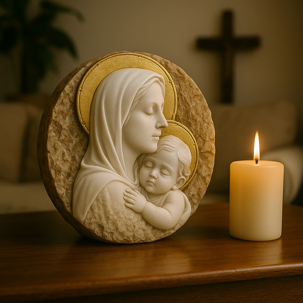Este delicado adorno de mesa representa Nossa Senhora acolhendo o Menino Jesus em seus braços. com traços suaves e um fundo circular que evoca a eternidade do amor materno. Os halos dourados em destaque simbolizam a luz divina e a santidade do vínculo entre mãe e filho.