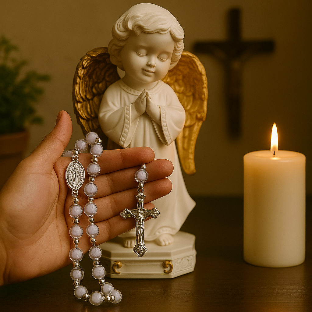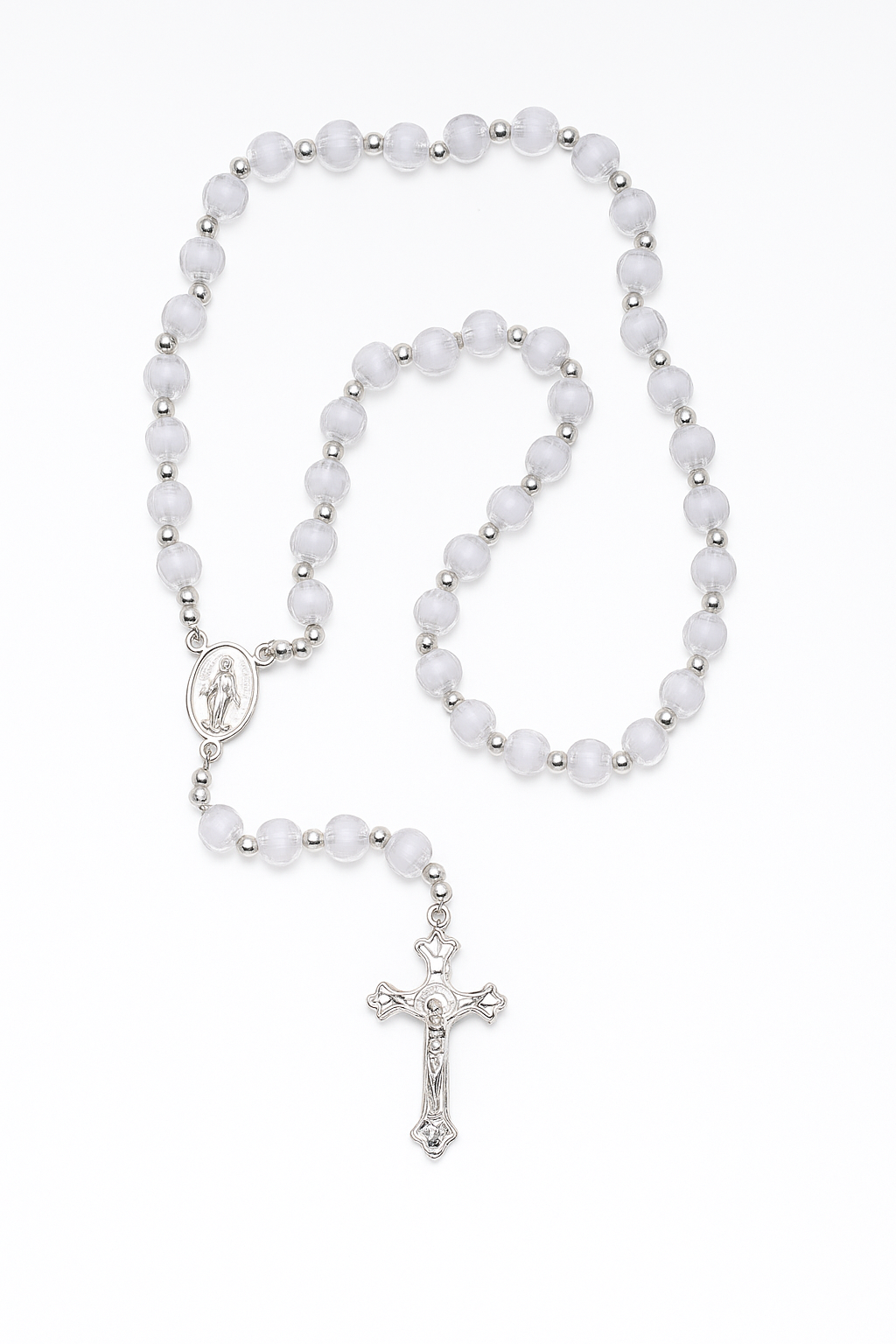 Este lindo terço é confeccionado com contas peroladas translúcidas que refletem suavemente a luz. criando um ambiente de serenidade durante a oração.