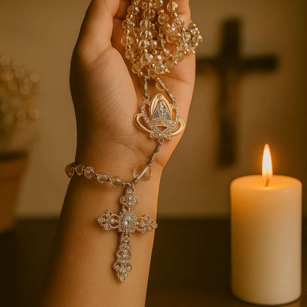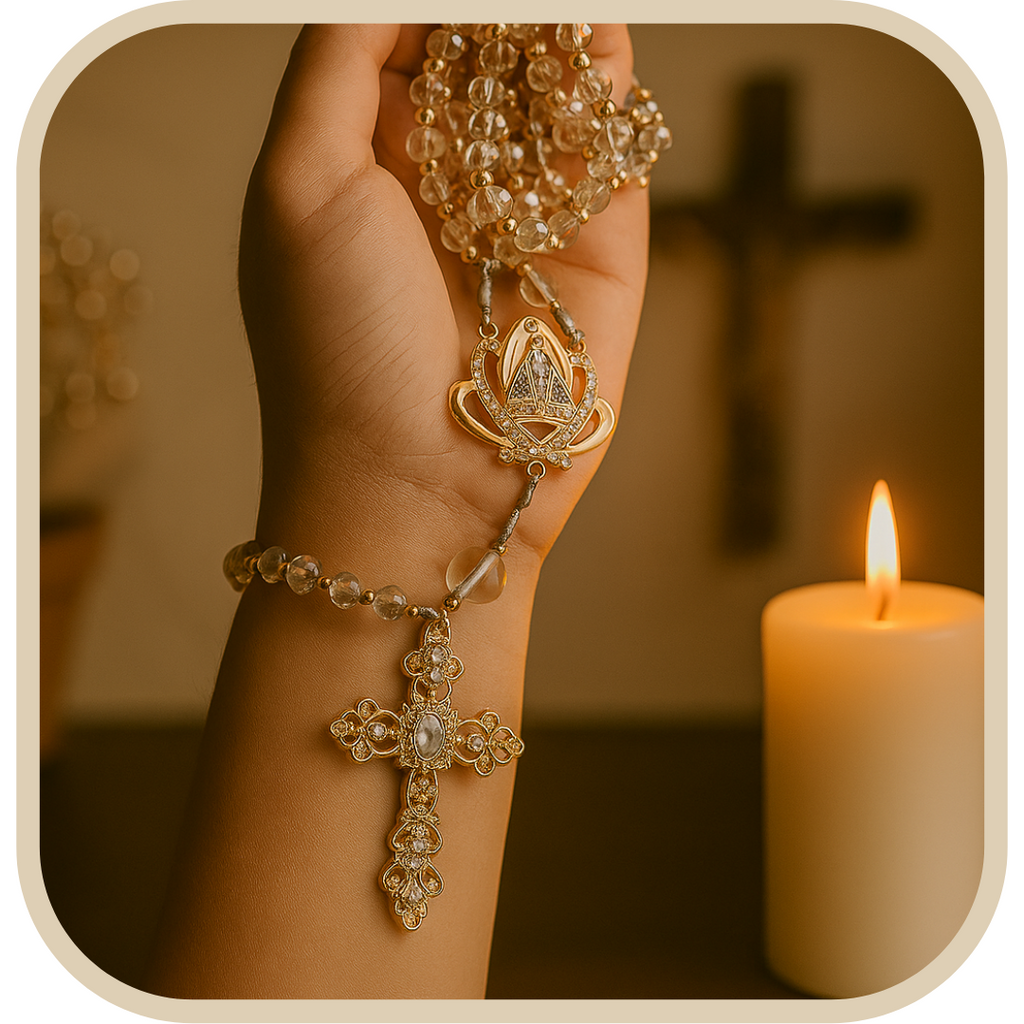 Terço de Noiva - Cristais Transparentes e Medalha de Nossa Senhora Aparecida ®