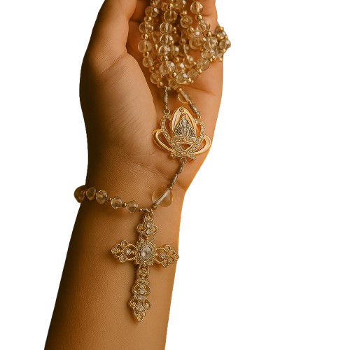 Este terço de noiva é uma peça exclusiva. delicadamente confeccionada com cristais transparentes que refletem luz e brilho. simbolizando pureza e esperança para o novo lar.